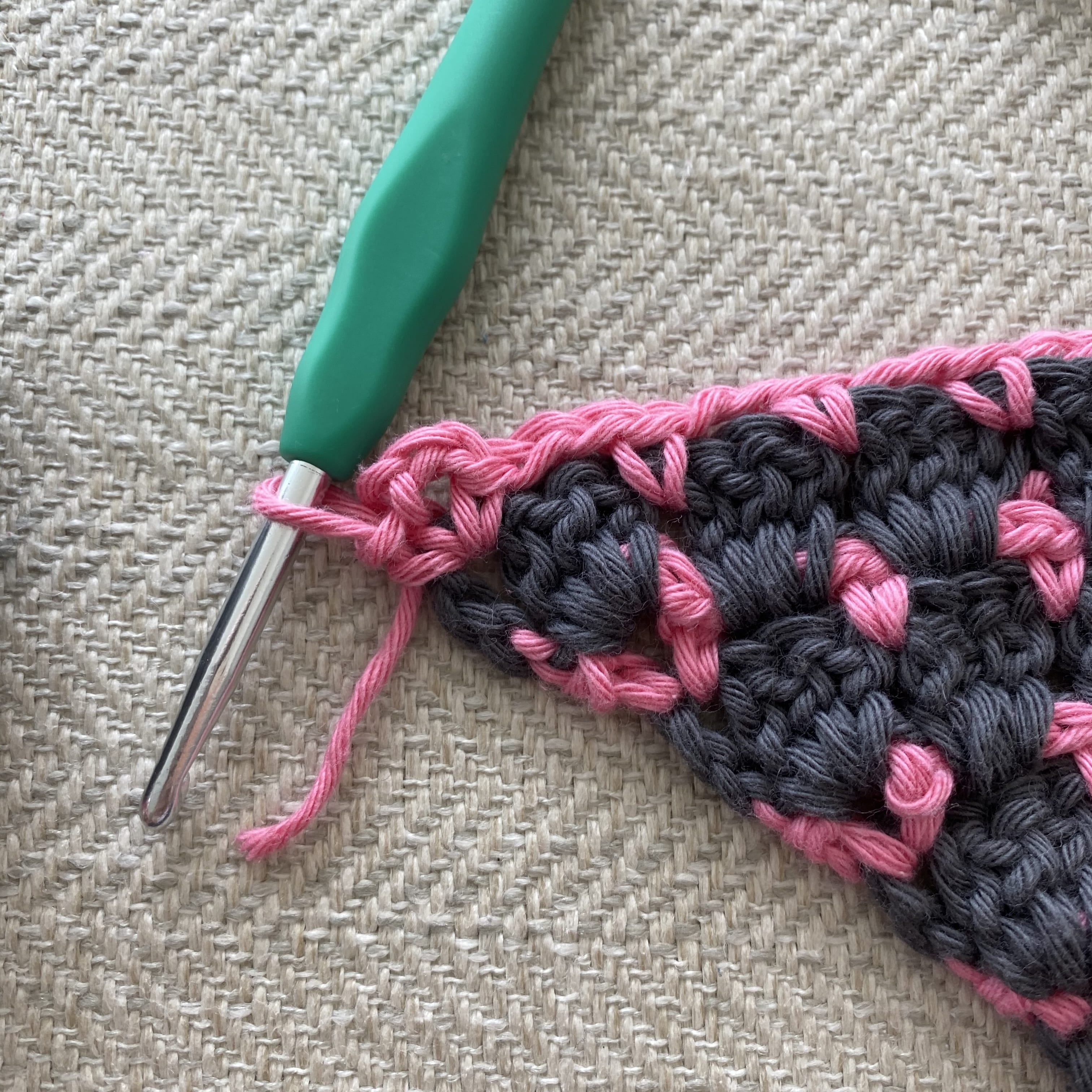 Row 3: Change colour, sc, *sc ch2, sk 2 ch* repeat to last 2 stitches, 2 sc.