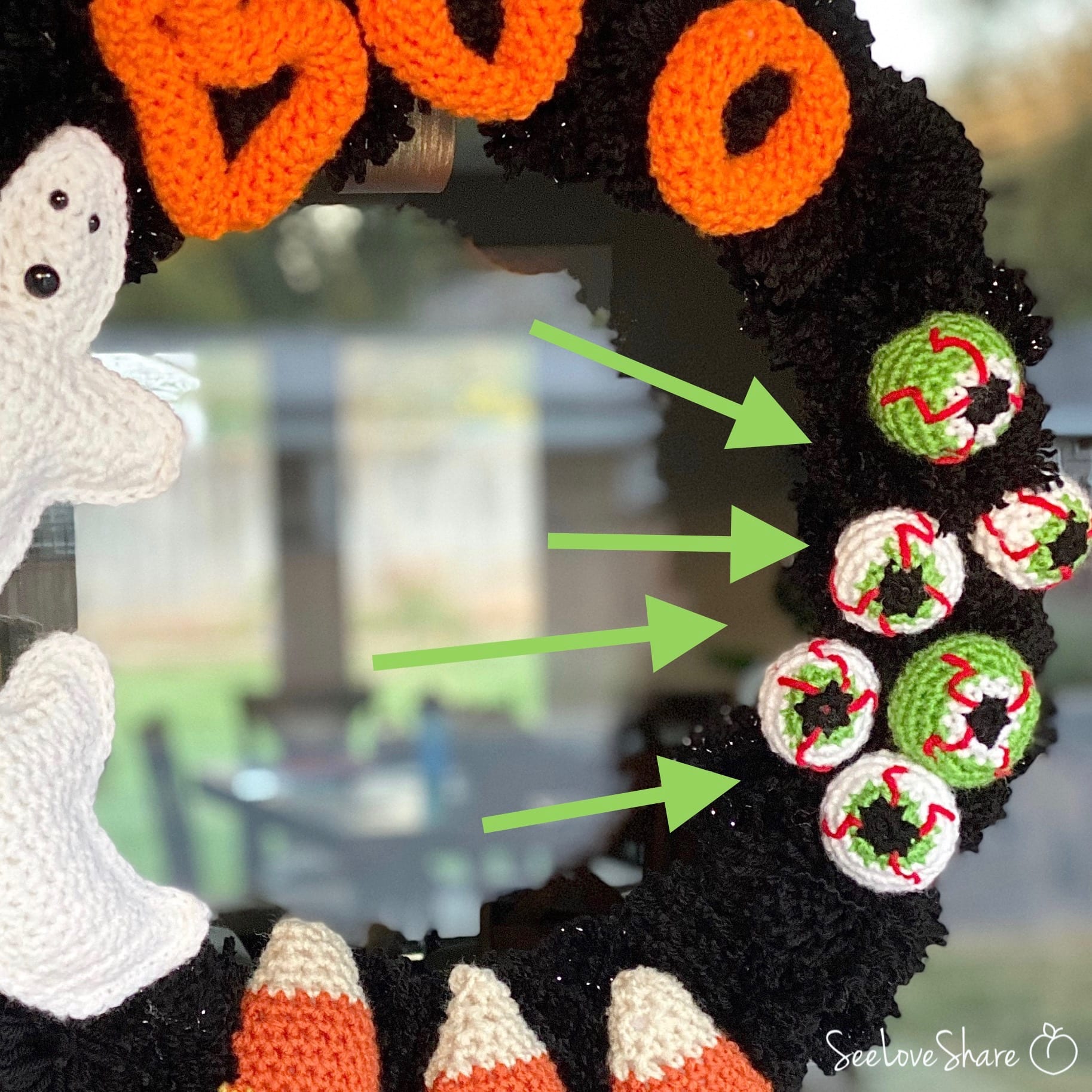 My Halloween wreath just wasn’t complete without these gross (and cute) eyeballs! They work up in a flash and are a MUST for any halloween decorations! Thank you to those that pointed out I hadn’t get written up this pattern! Enjoy!