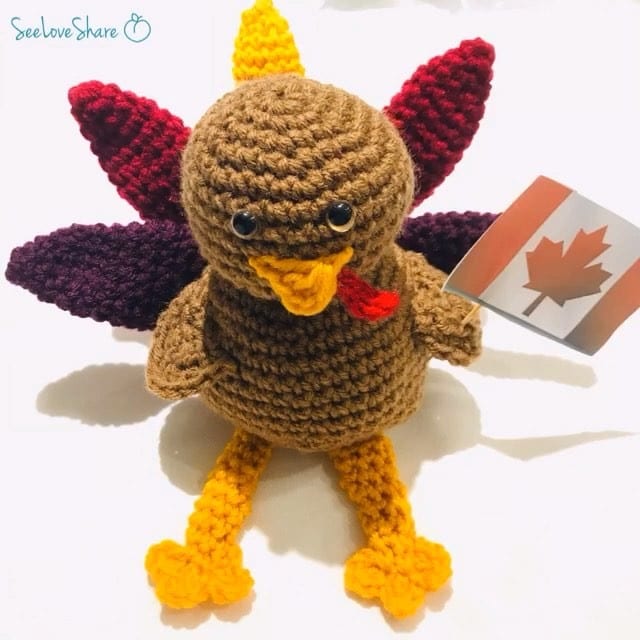 Make 5- 1 each blue, orange, red, green, goldbegin with a magic ring (mr)Round 1: in mr, ch 1, 4 sc (4 sc)Round 2: [2 sc in first stitch, 1 sc in next] repeat (6 sc)Round 3: [2 sc in first stitch, 1 sc in next 2] repeat (8 sc)Round 4: [2 sc in first stitch, 1 sc in next 3] repeat (10 sc)Round 5: [2 sc in first stitch, 1 sc in next 4] repeat (12 sc)Round 6-8: 1 sc in each stitch (12 sc)Round 9: [2 sc in first stitch, 1 sc in next 5] repeat (14 sc)Round 10-14: 1 sc in each stitch (14 sc)Round 15: [sc2tog, sc in next 5] repeat (12 sc)Round 16: 1 sc in each stitch (12 sc)Round 17: [sc2tog, sc in next 4] (10 sc)Finish off, cut yarn leaving long end for sewingSew feathers to back of turkey in a semicircle shape