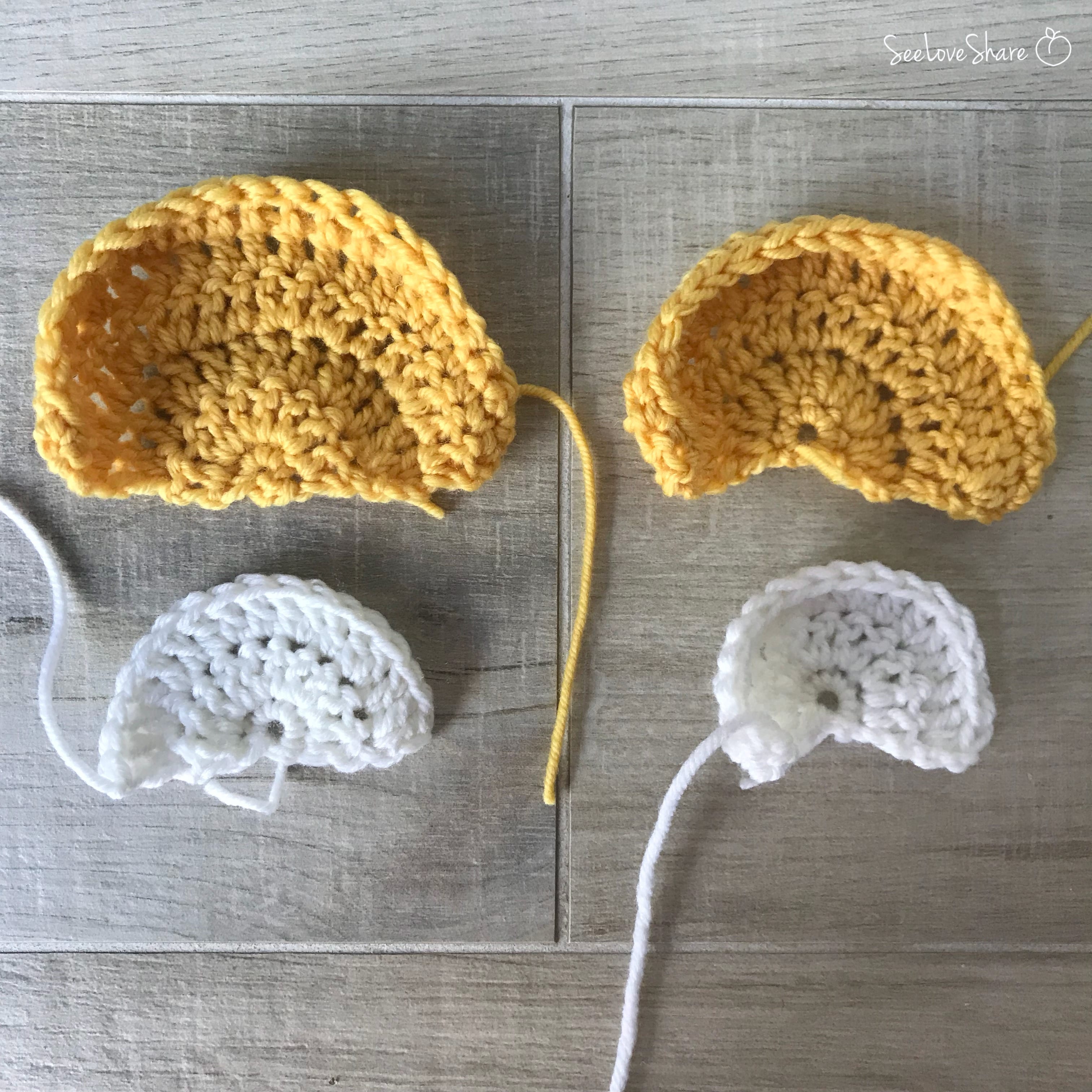 Sew the inner white ear to the larger yellow ears and attach to ether side of the hood.