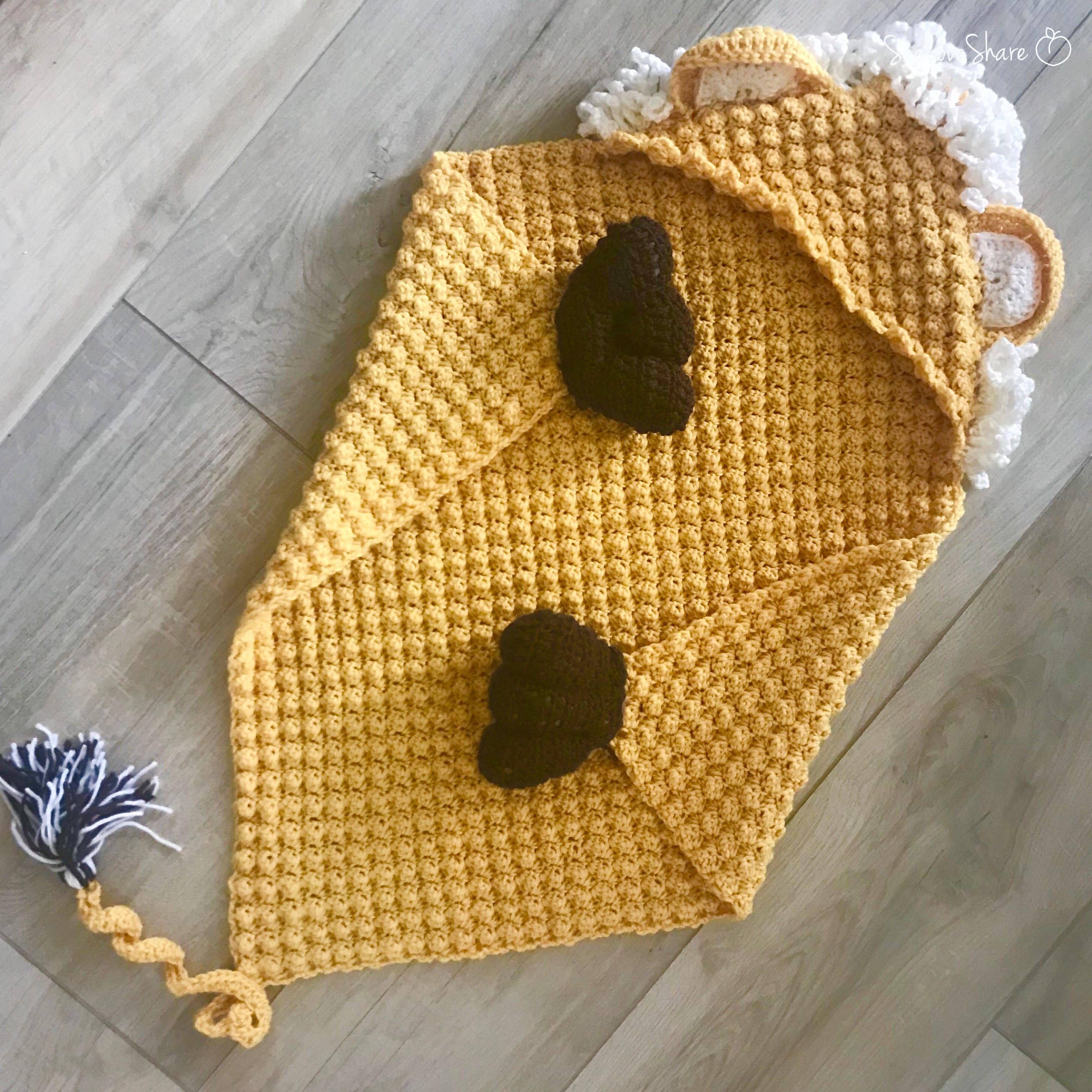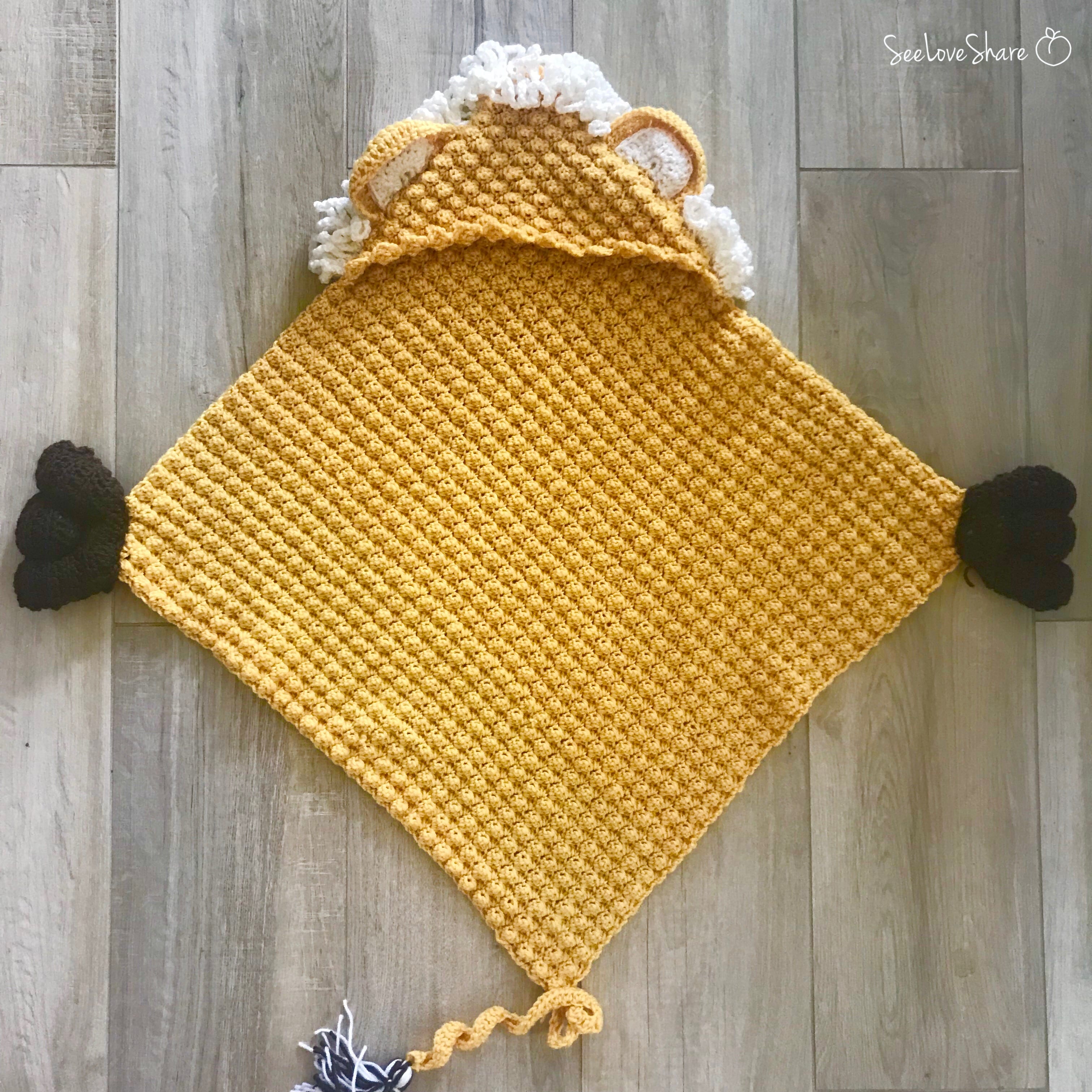 For the mane, attach white with a ss at the base of the hood, ch 15, ss in the following stitch around. Repeat once more with ch 20 immediately behind the first row – there should be two rows of ch loops with the back set being a little bit longer than the first.