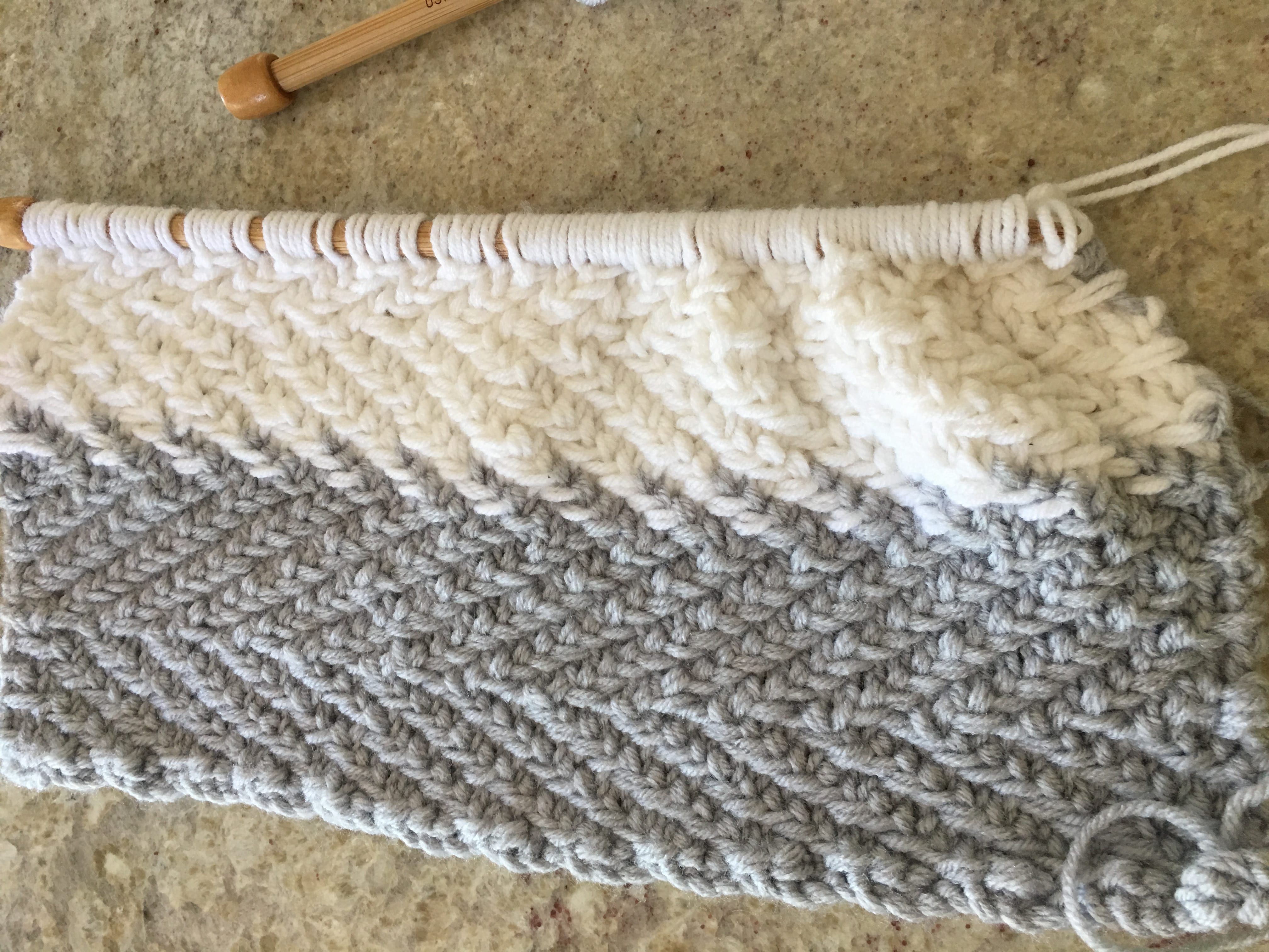 Continue working Rows 1-24 of Herringbone Stitch pattern, with alternating colours, until piece measures about 16 in. from beg. Bind off.